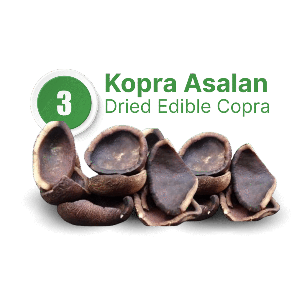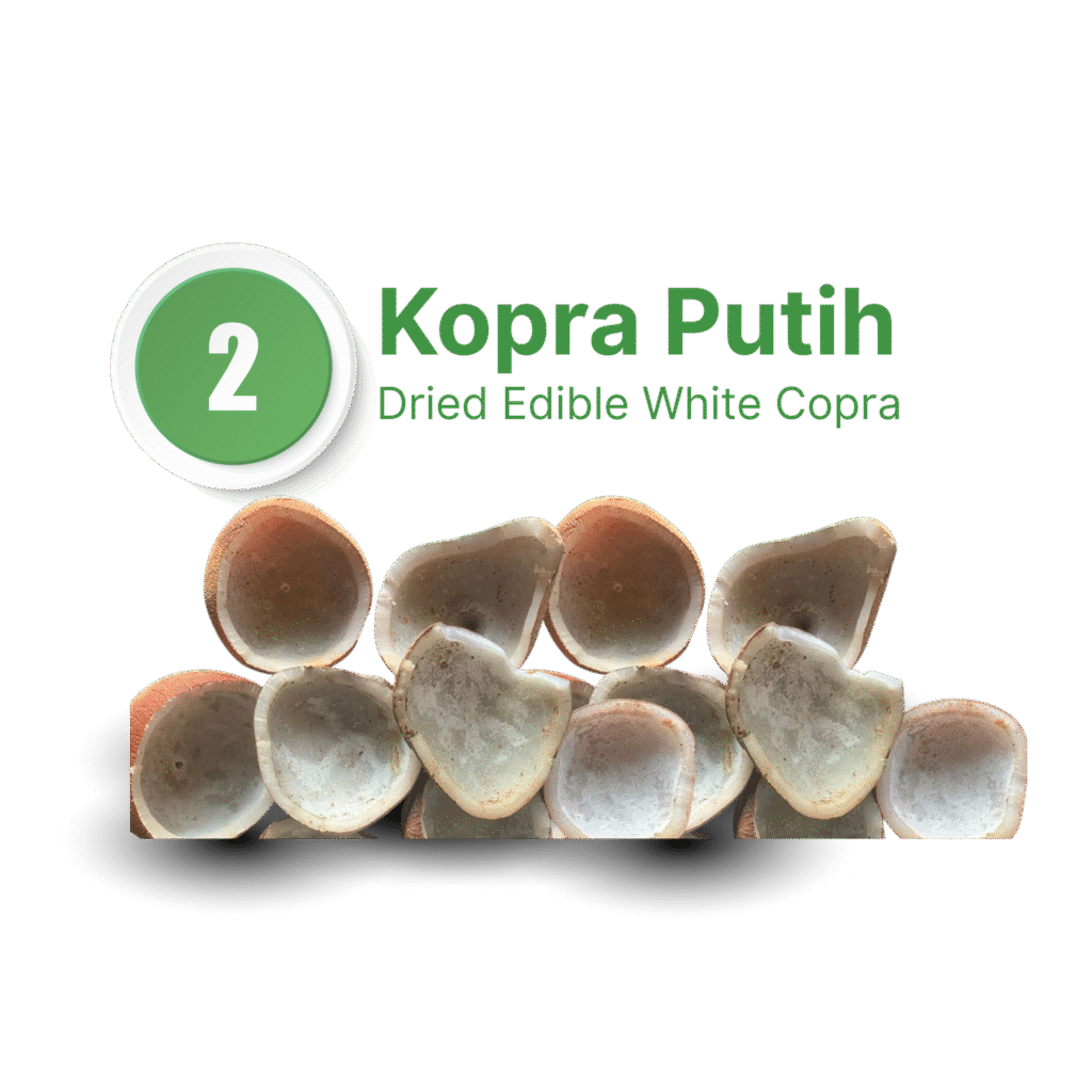 Kopra putih adalah memiliki kadar minyak minimal 65%, kadar air maksimal 5%, dan warna putih bersih karena dikeringkan dengan metode tidak langsung (misalnya menggunakan rumah pengering atau oven) dan sering kali ditambahkan belerang untuk mencegah jamur dan menjaga kebersihan